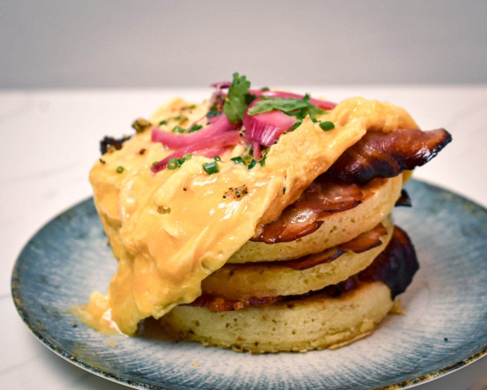 Pancake, Scrambled Eggs, Bacon, Pickled Onion, Chives